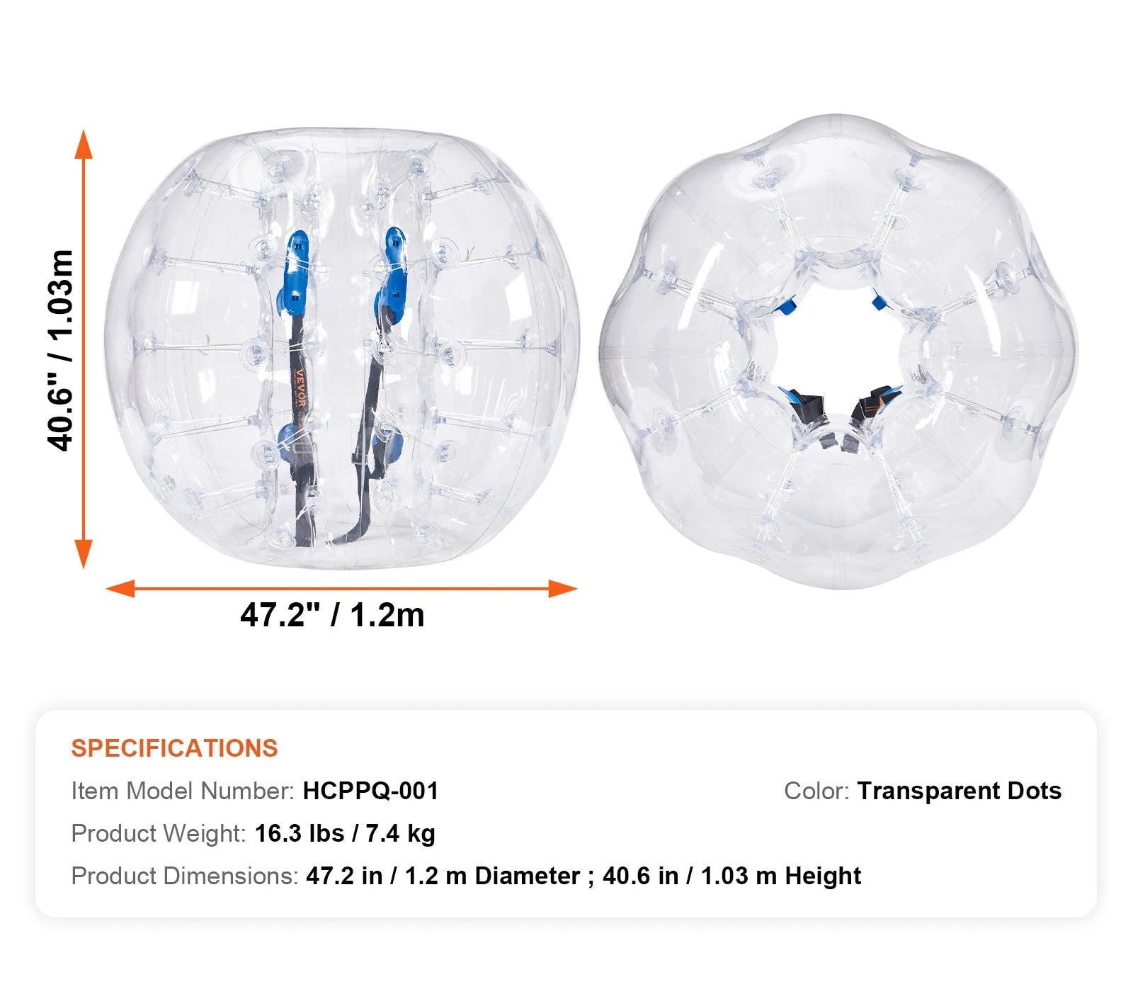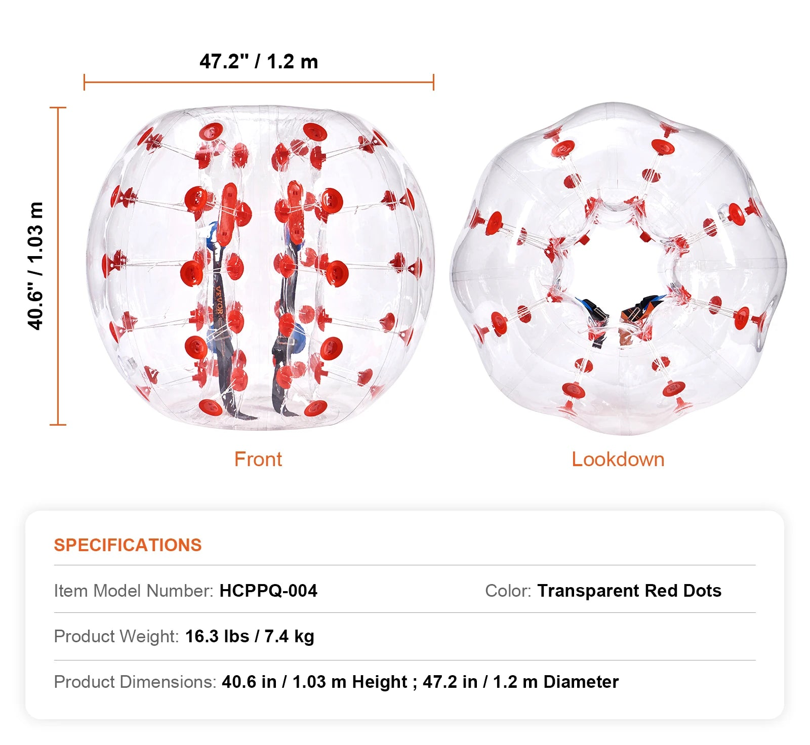 La sécurité rencontre le plaisir : la sécurité du joueur est primordiale dans nos aventures en cas de choc. Dotées de poignées souples en PVC intégrées de conception ergonomique, nos balles zorb offrent une sécurité accrue de l'intérieur. Les bretelles réglables élargies atténuent efficacement la pression sur les épaules, fixant les joueurs fermement à l'intérieur.